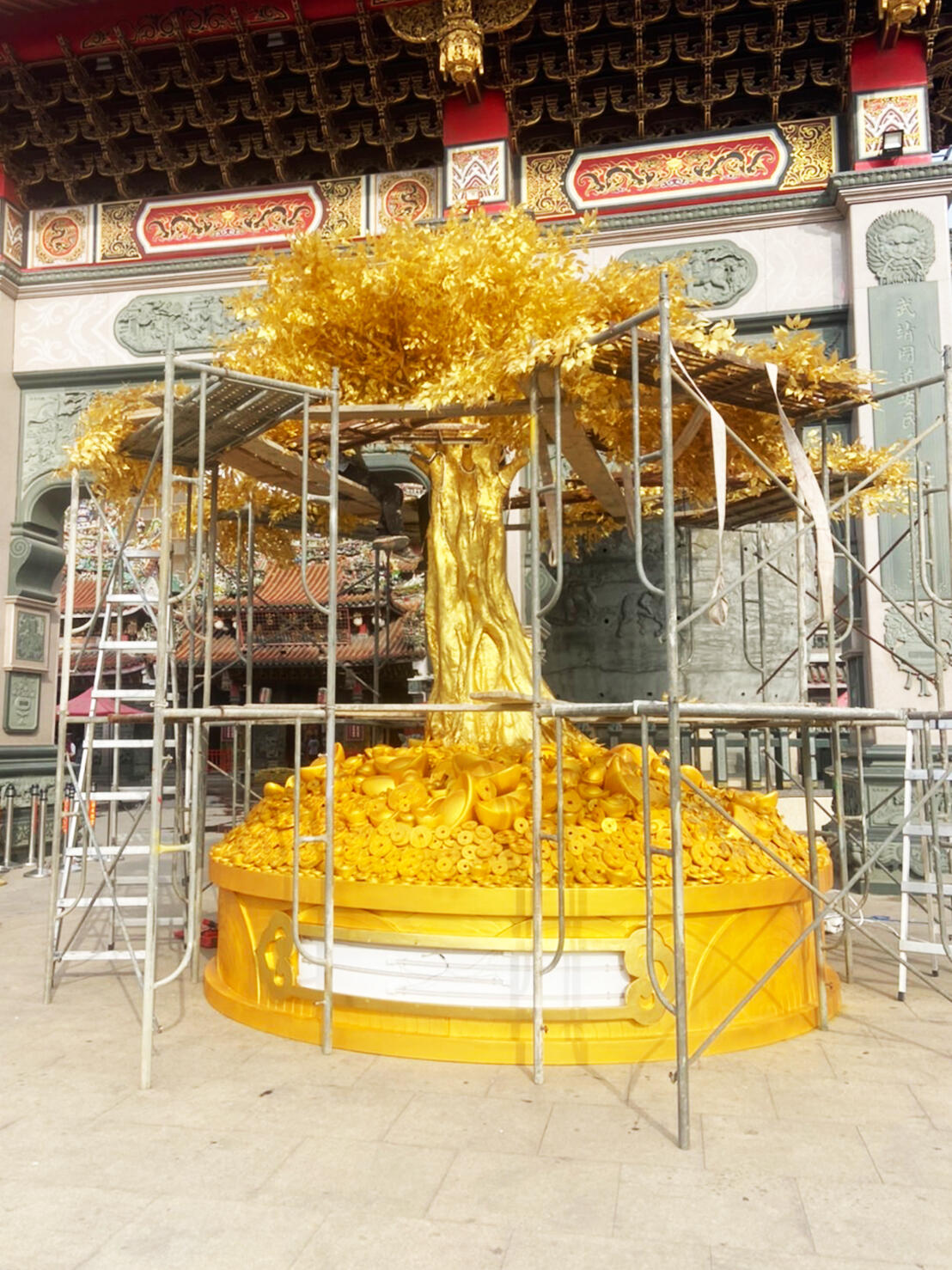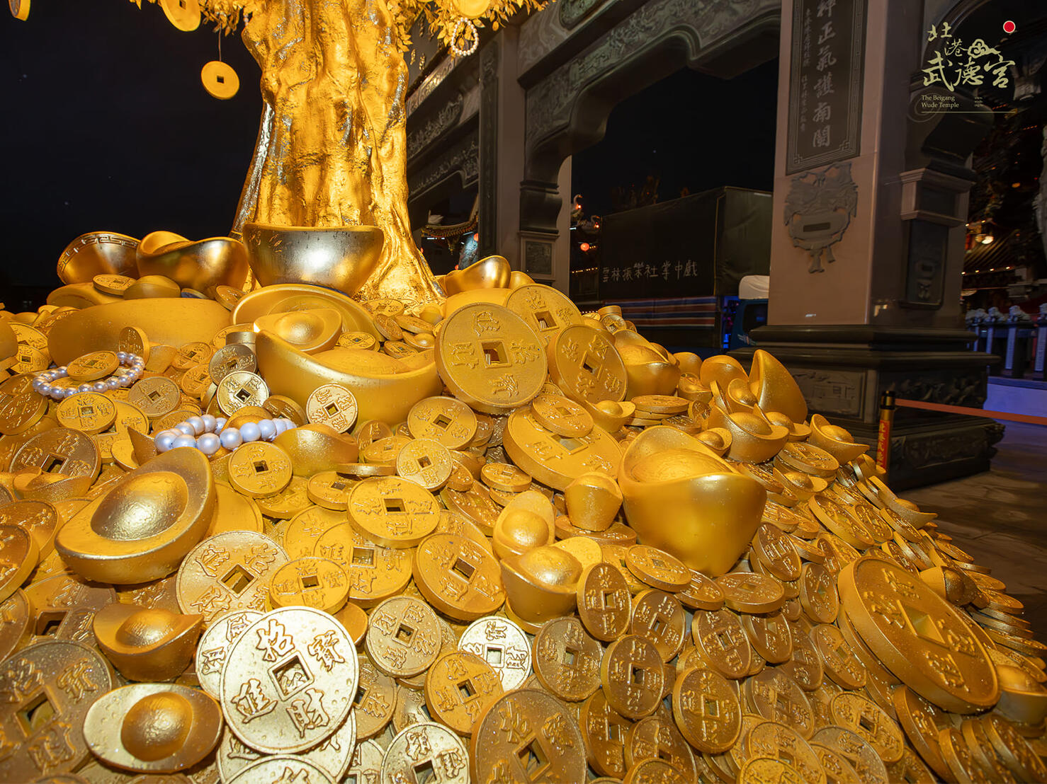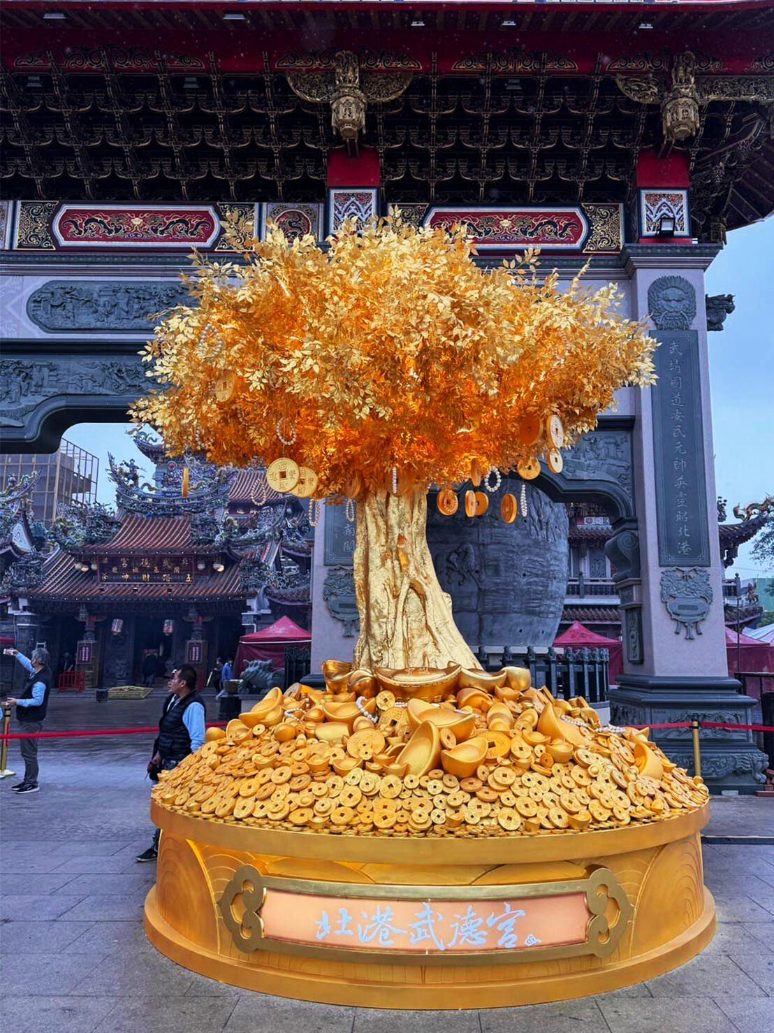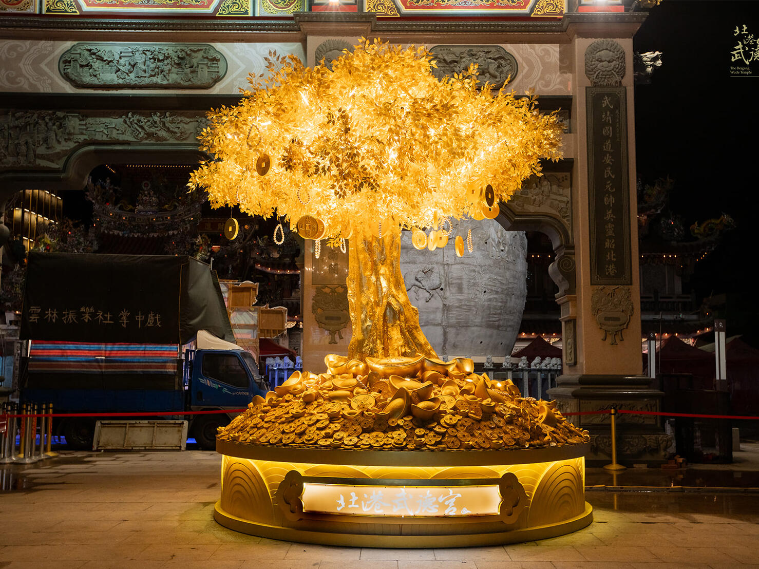 國內財神祖廟的雲林縣北港武德宮,2024年新春翰億與武德宮合作一顆高達4.5公尺的「財神寶樹」藝術工程,樹身金光閃閃,不僅金枝玉葉,土方全是金銀財寶,全使用FRP玻璃纖維材質製作出許多大小銅錢及元寶,其中樹身及元寶表面按上銅箔顯得更加貴氣,吸引大批遊客爭相和黃金發財樹合照,為自己添添財氣,夜間搭配LED燈光效果,金光竄天,宛若財神下凡,為新的一年增添不少財運喜氣。