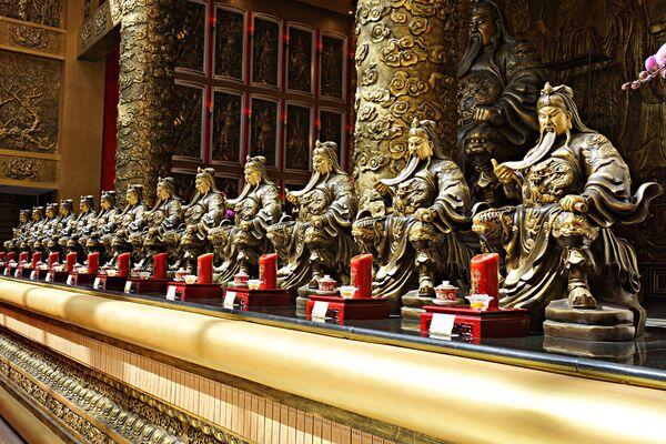 飛天銅獅、飛天女、牌樓、鐘鼓樓、盤龍、周倉、關平、關公、門神、龍柱、飛天女浮雕、還願牆36尊